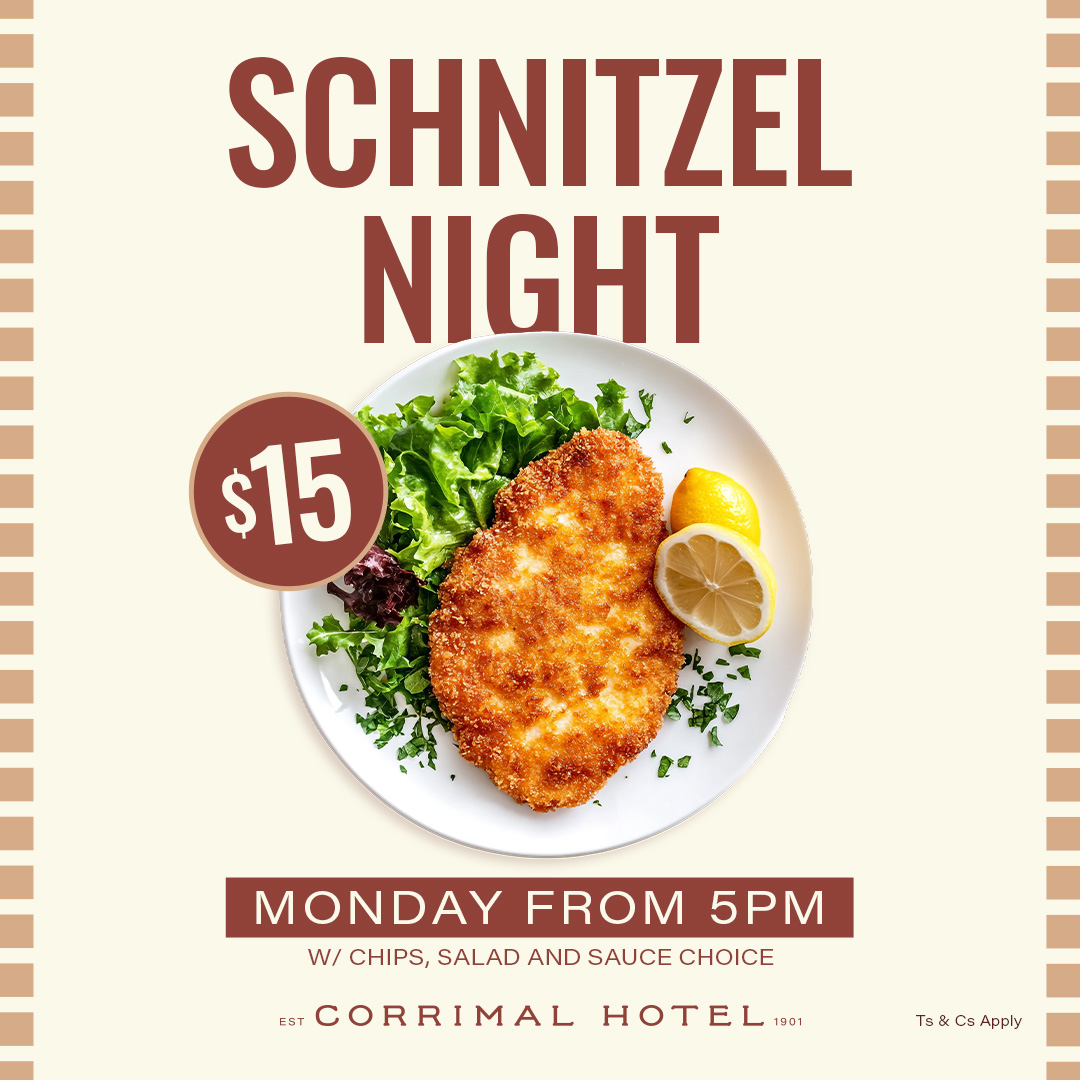 Enjoy a golden, crispy chicken schnitzel served with chips, salad, and your choice of sauce.