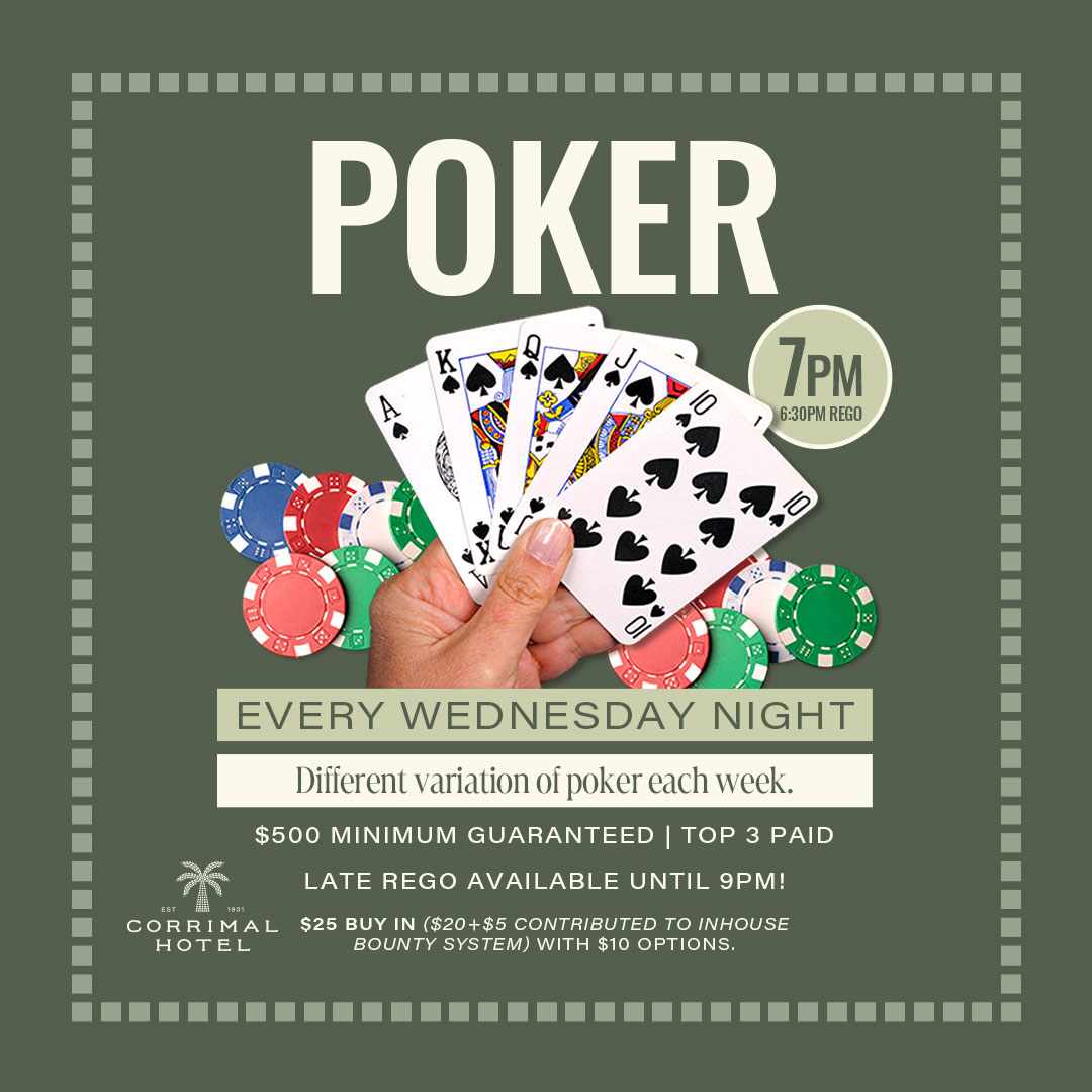 Expect a different variation of poker each week. $25 buy in ($20+$5 contributed to in-house bounty system) with $10 options.